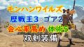 歴戦王ウズトゥナのトゥナムルシリーズを3つで火力、根性、それとゾシア装備を2つ使い自動回復と回復速度3、さらに整備5で装衣を2種類交互に使いやすくなる双剣用の装備の紹介です。